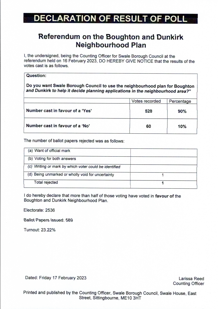 Welcome to the Boughton and Dunkirk Neighbourhood Plan website. The documents here show much of the work done to produce, at a referendum, a legal planning document for the two parishes that has full planning weight alongside Swale’s out of date Local Plan (Bearing Fruits). The Plan can be downloaded from ‘Referendum Final Documents’ along with the background documents that supported the plan at inspection. If you require any further information, please email cllrtutt@dunkirkpc.gov.uk or Tel: 07885371631